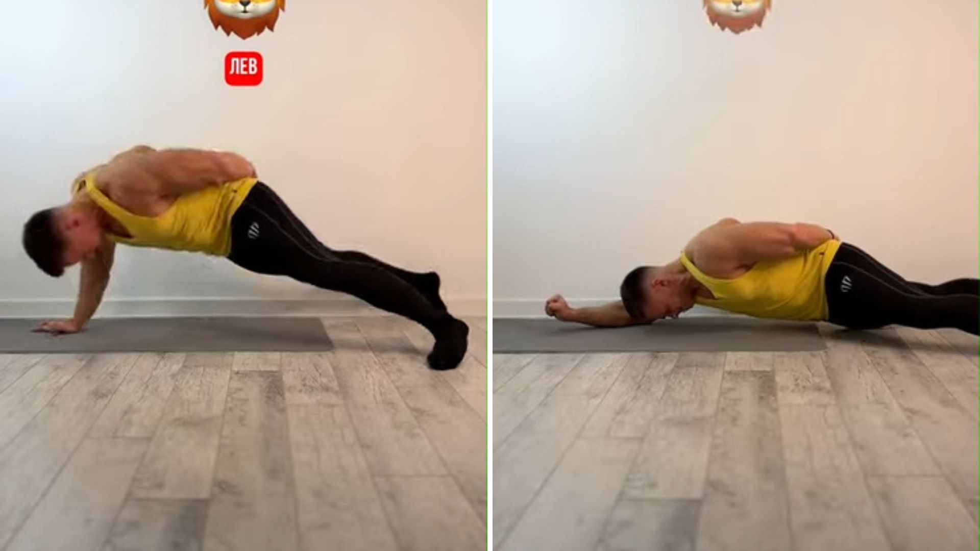 Прими положение упора лежа, широко расставив ноги. Одну руку оставь на полу, а вторую упри в бедро одноименной ноги. Стараясь не разворачиваться корпусом в сторону свободной руки, делай отжимания, касаясь грудью пола.